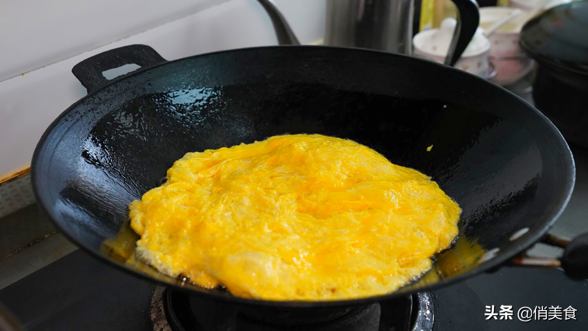 5、锅中加入油烧热,加入蛋液,蛋液煎至两面金黄,然后把蛋液炒碎放入碗中备用。