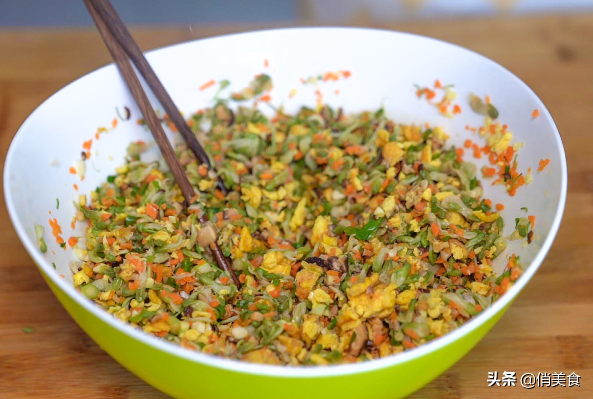 4、槐花放凉后水分挤干一下,加入切碎的胡萝卜丁,再加入鸡蛋、葱花、盐、香油搅拌均匀后馅料就调好了。