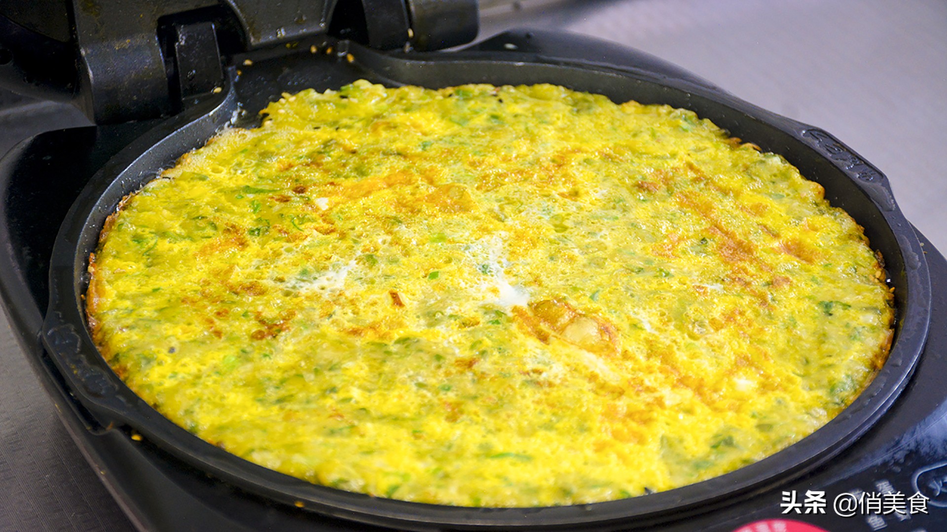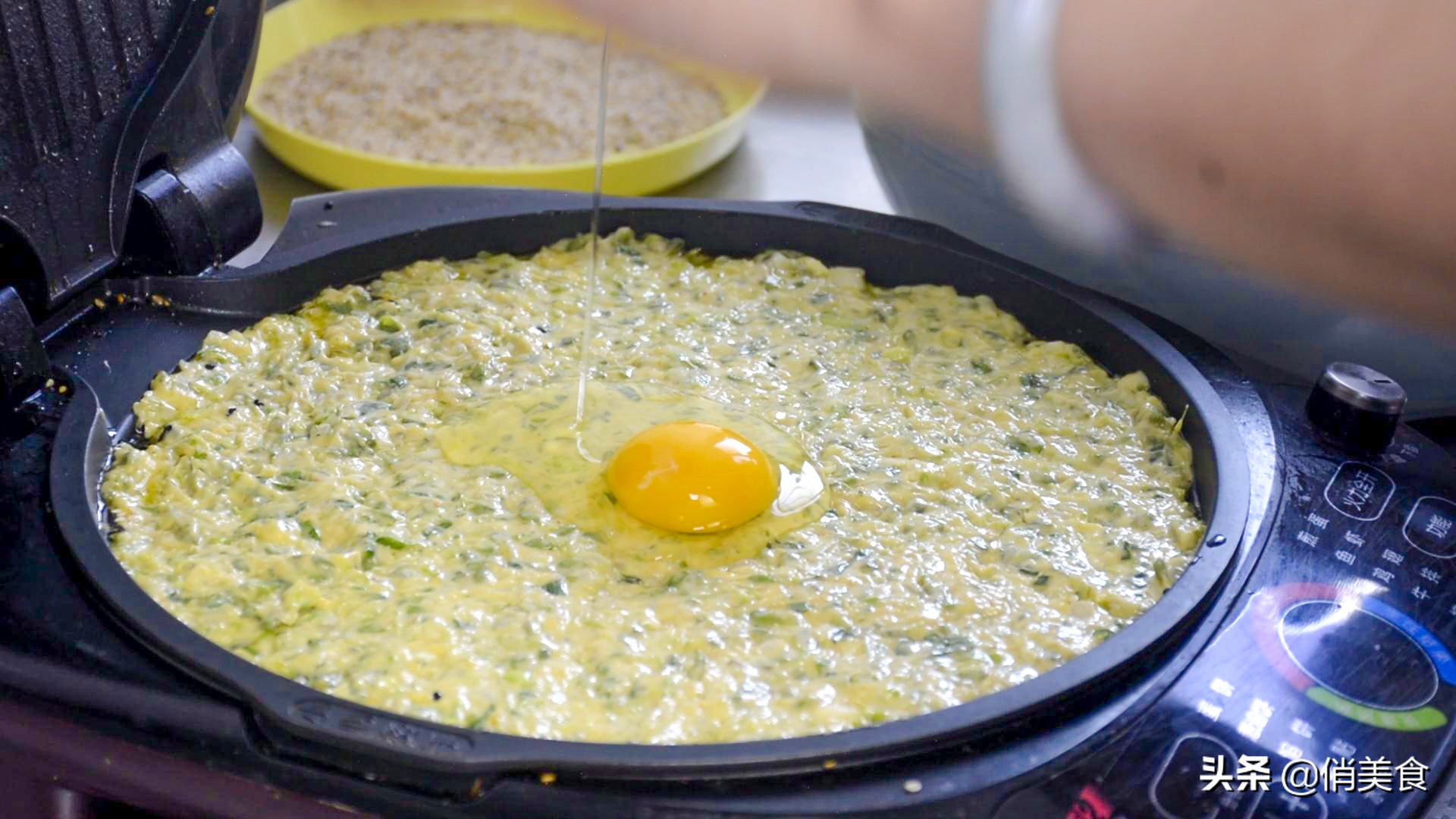 4、电饼铛预热刷上一层食用油,洒上一些生芝麻,然后把调好的面糊放入电饼铛中,用铲子把饼摊平,摊均匀后再打上去一个鸡蛋,用刷子把蛋液搅散,盖上盖上后选择馅饼模式煎5分钟。