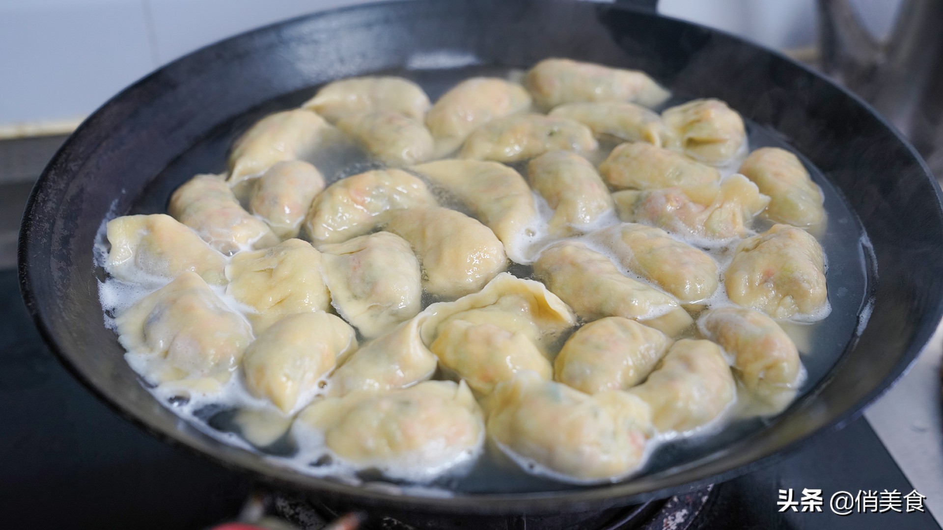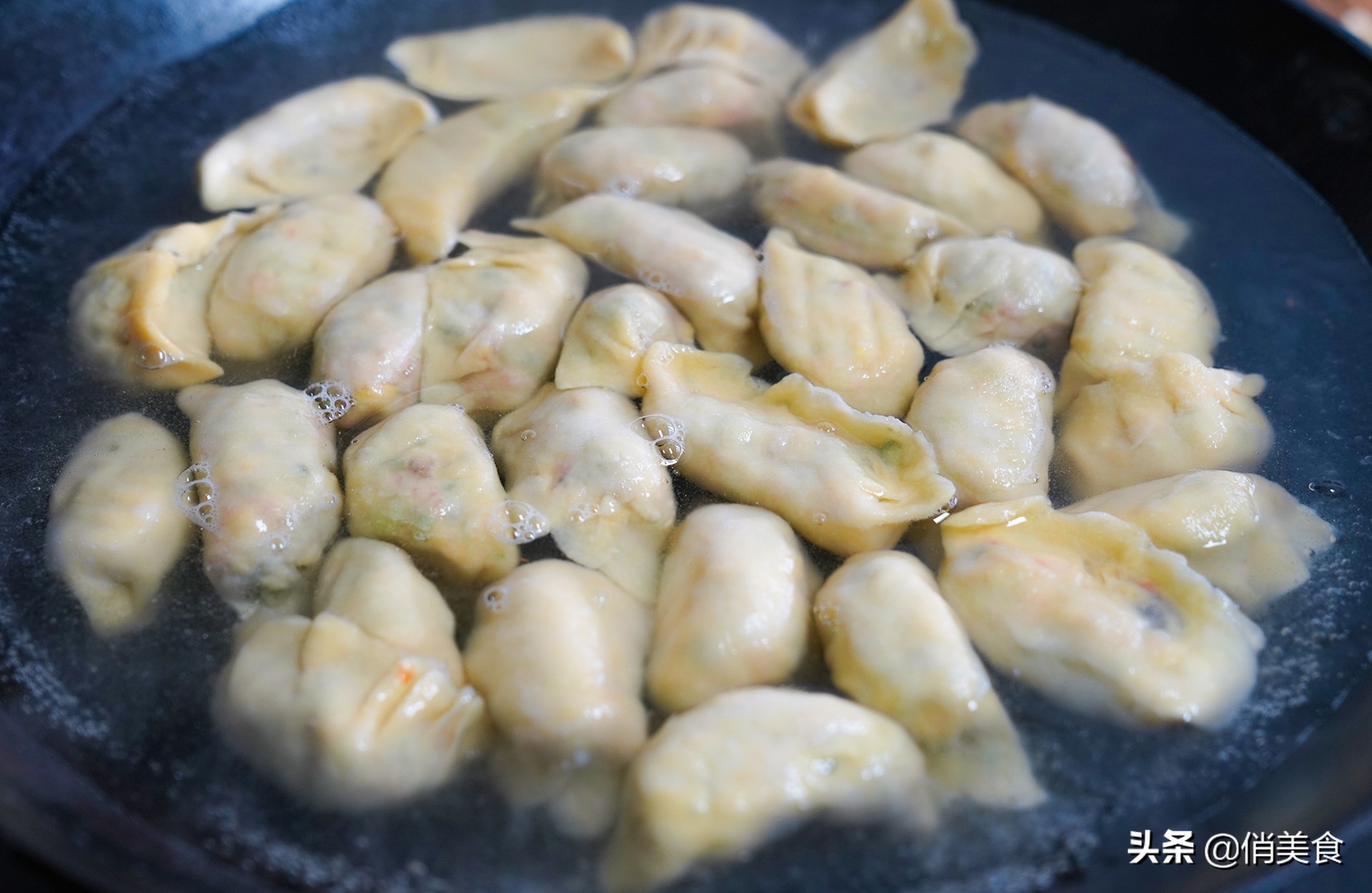 6、水开后下入饺子用勺背轻轻推一下,防止饺子粘连在一起,盖上盖子开大火煮开,煮开后加入清水,煮开两次就可以了,因为素馅的饺子很容易熟不需要煮的太久。