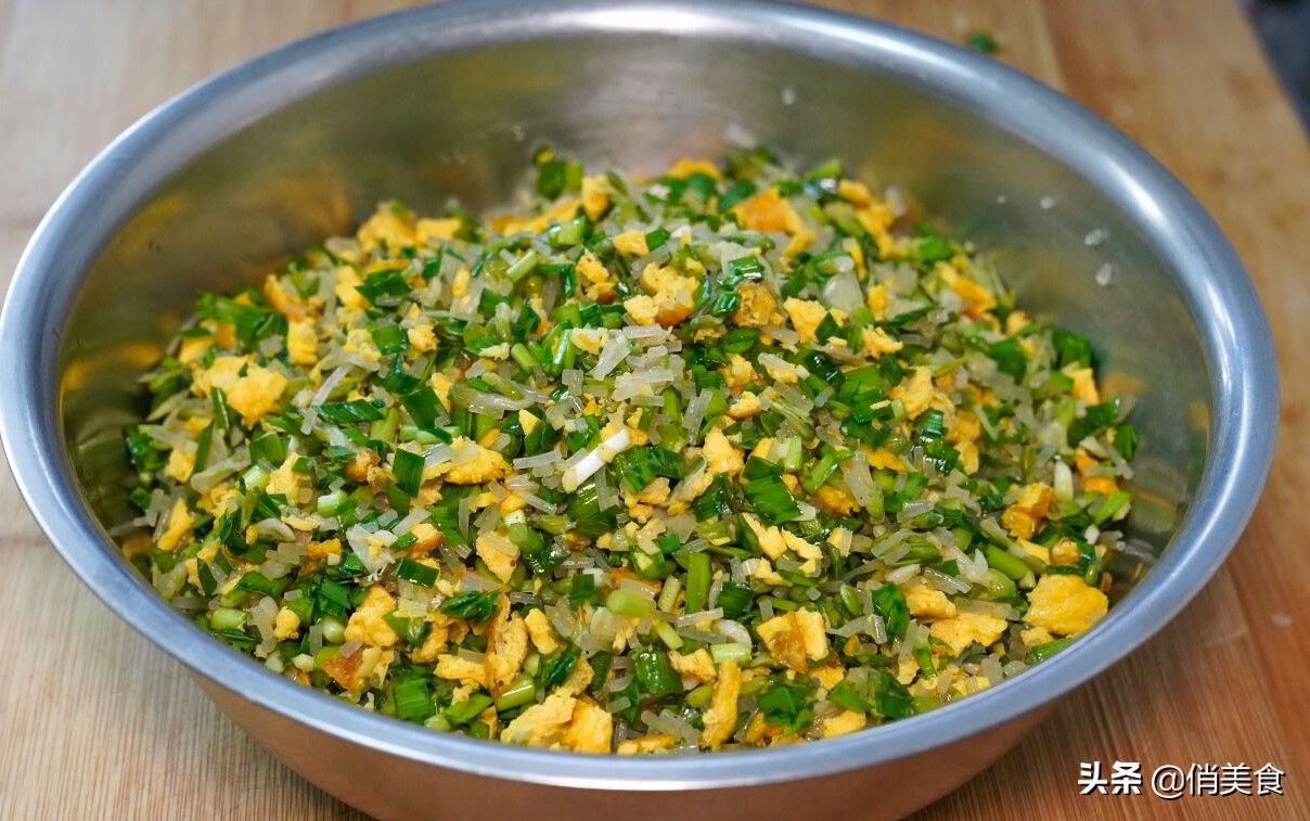 6、下面来调味锅中留底油放入葱白爆香,然后把火关掉,加入挤干水分的槐花、粉条、鸡蛋、翻拌均匀后再加入韭菜,加入食用盐、香油翻拌均匀我们的槐花韭菜馅就调好了。拌馅料时最好不要加多余的调料,因为这样会掩盖槐花和韭菜原有的香味。