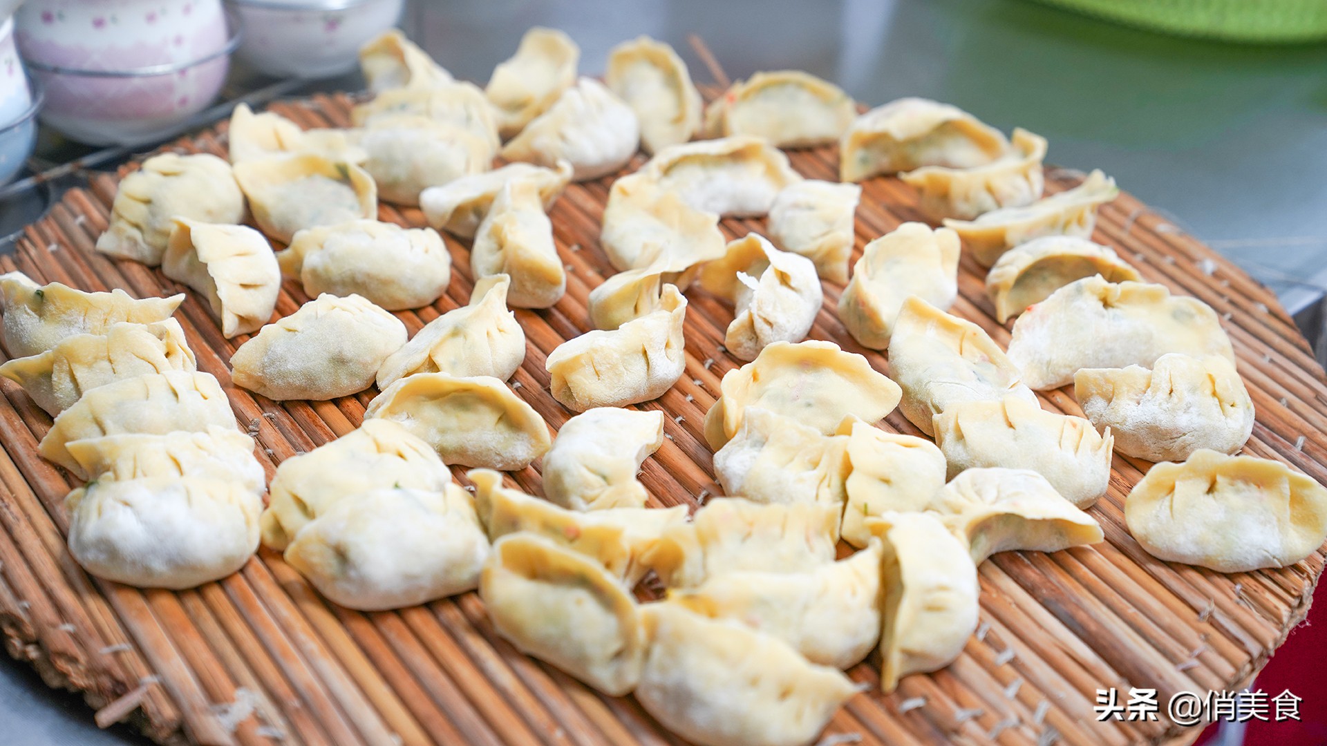 5、面团醒好后,把面团搓成长条,切成大小均匀的剂子,按扁后再擀成饺子皮,下面就开始包饺子了。