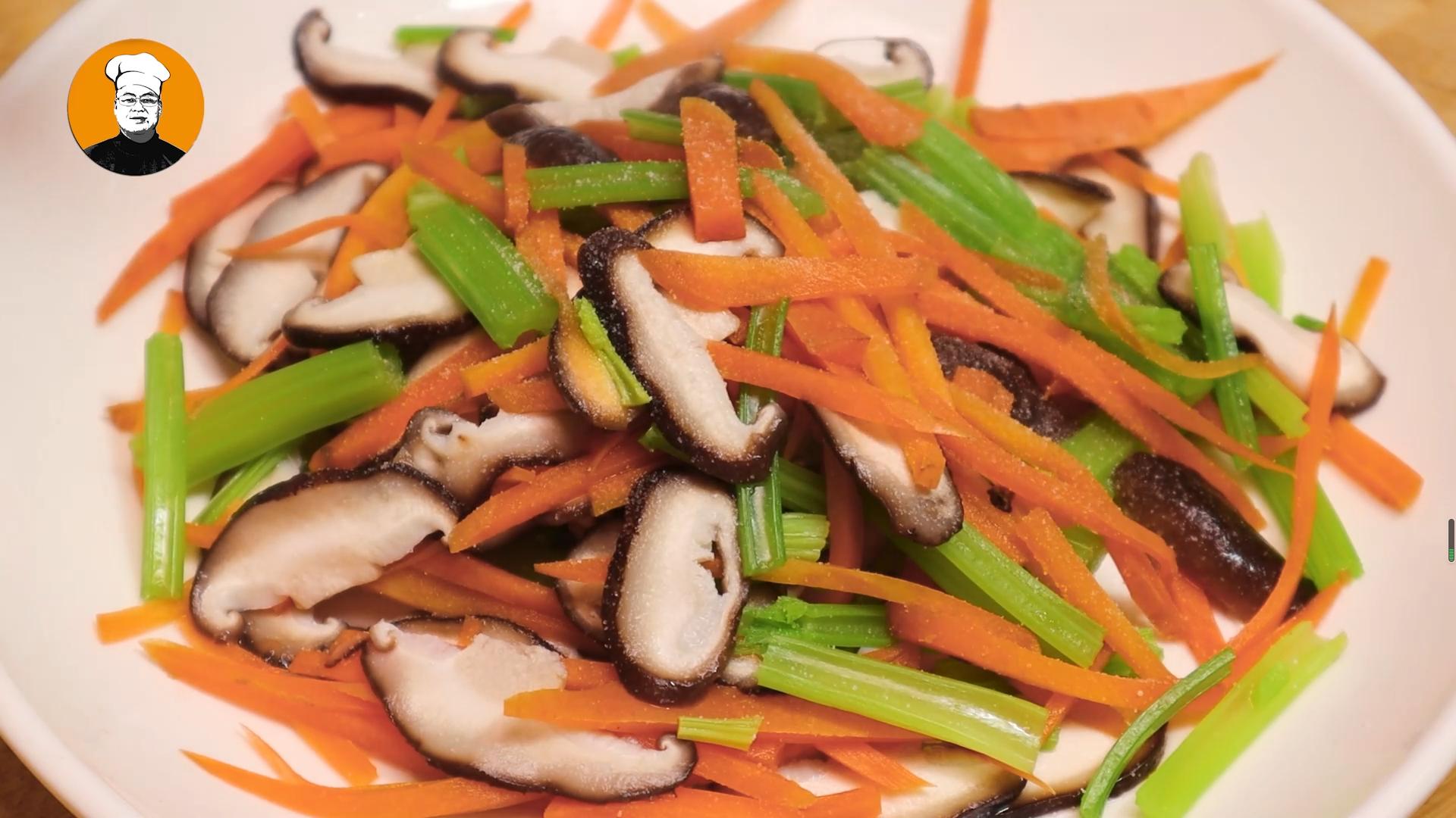 5、再把香菇去蒂以后切香菇片,胡萝卜切丝,芹菜切段,再把切好的所有蔬菜放入锅中,烫十五秒捞出沥干水分备用。再撒上少许食盐、生抽,拌匀后备用