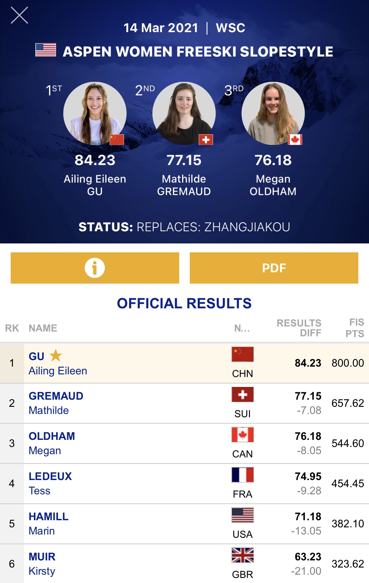 3轮决赛,谷爱凌是全场唯一得分超过80分的选手,她最终凭借首轮成绩赢得金牌。平昌冬奥会亚军、瑞士选手格雷莫德以77.15分获得银牌,加拿大选手奥尔德哈姆以76.18分获得铜牌,2017年世锦赛冠军勒德克斯以74.95分排名第4。