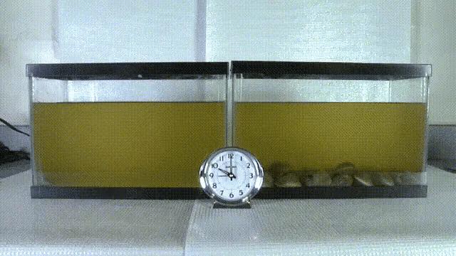 贝类的滤食试验:左边水缸无贝类,右边水缸有贝类