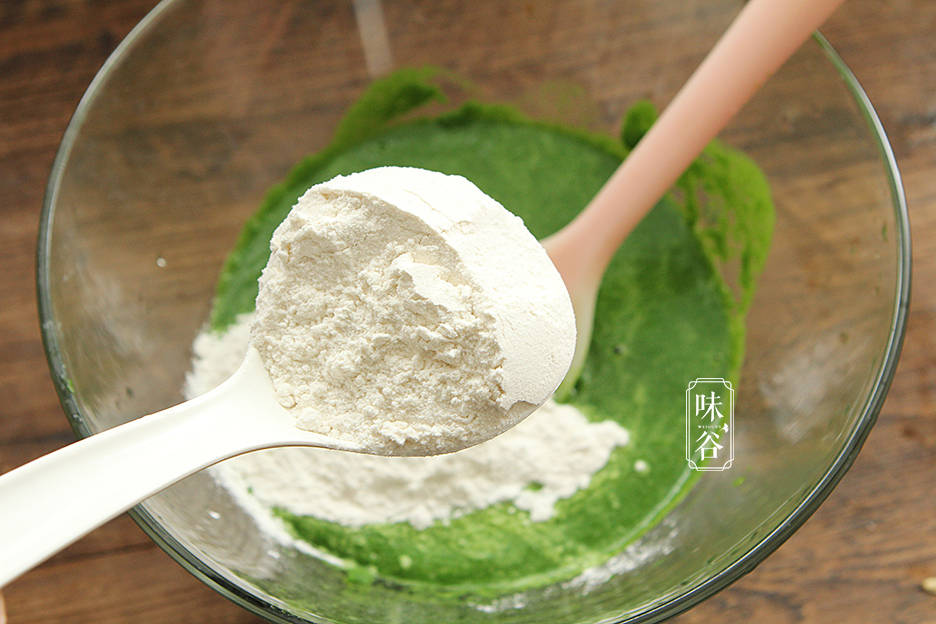 3、桑叶泥敲入2个鸡蛋和一点白糖,然后倒入面粉,一边搅一边倒,这里面粉的分量要看你的桑叶泥的湿度来调整;