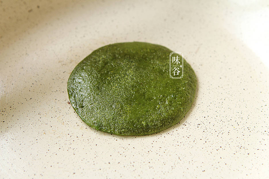 5、锅里加一点油,防止粘锅。大火烧热之后,转小火,舀一勺桑叶面糊放入平底锅中,使面糊自然地摊开成圆形,不用摊太厚,一面凝固后翻面,继续煎一下,多翻动几次全程小火煎;