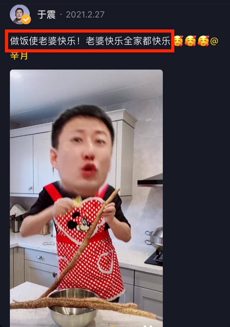 在家里于震还会主动下厨给辛月做饭。他表示做饭是为了让老婆快乐,老婆快乐才能全家人快乐,如此看来在于震心中妻子的地位是很重要的。