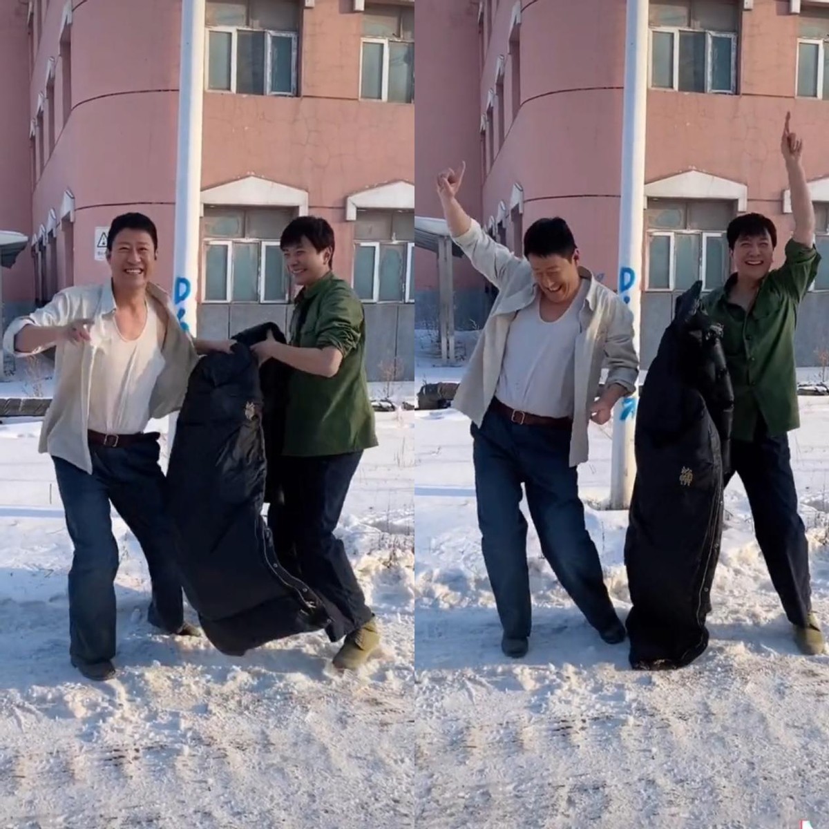 从镜头里可以看到,于震所处的地方温度并不高,地面上还堆着一层厚厚的积雪。而从他和周围人的造型上来看,可以推测他应该是在片场。