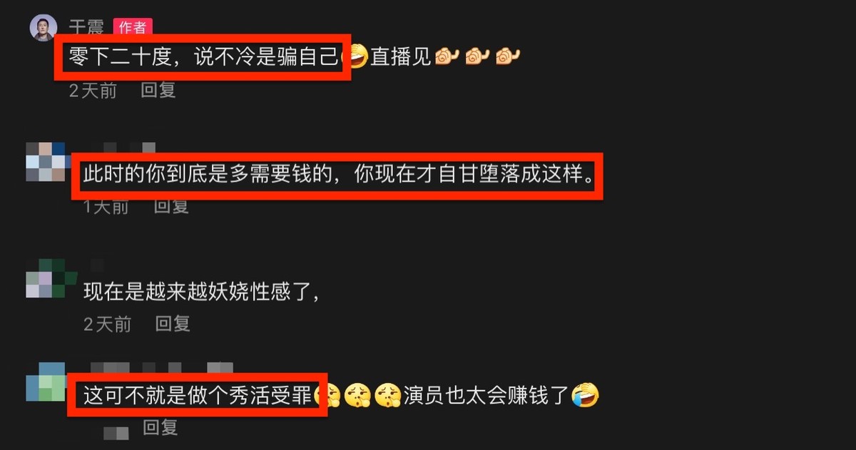 于震还在评论区说明当时零下二十度,说不冷都是骗自己的,而他的舞姿也被网友们调侃越来越性感妖娆了。还有人指出于震在雪地里热舞的行为就像是作秀活受罪,好奇他是否是缺钱了才会如此。