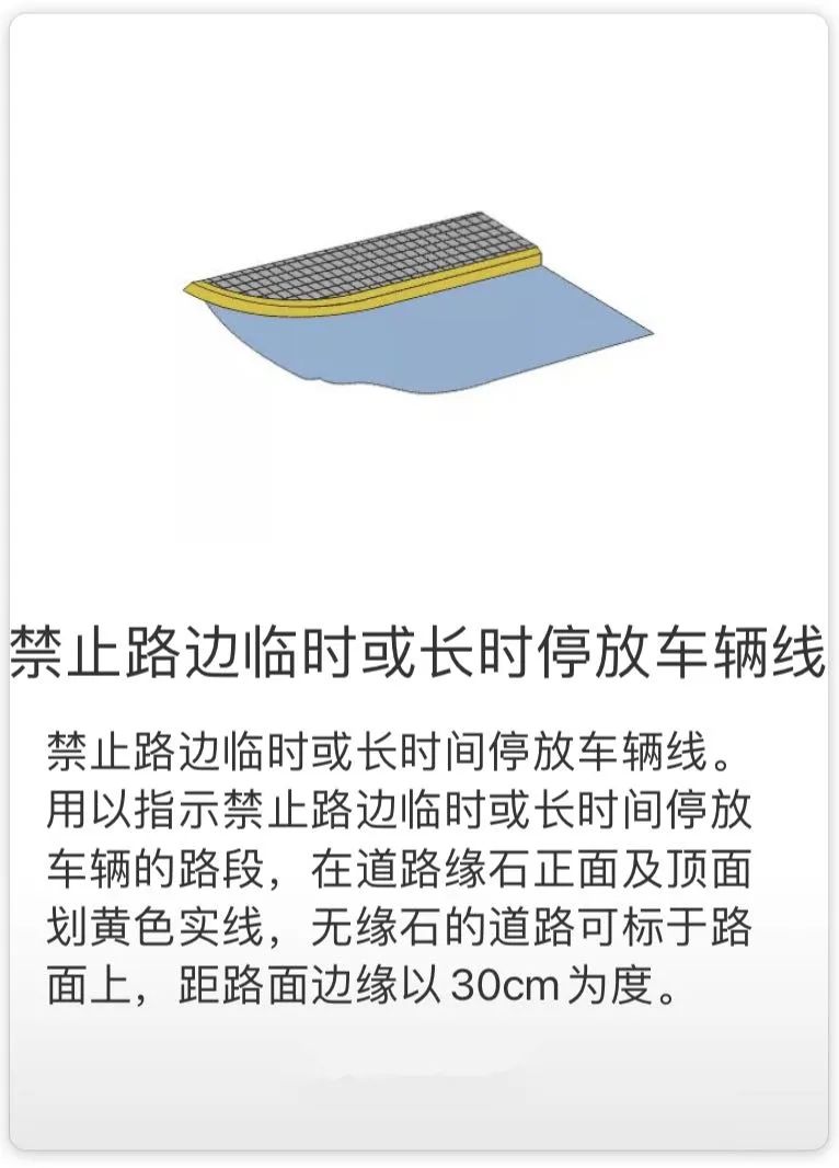 路缘石上的黄色实线,这是禁止停车的标线,常配合设置禁止停车标志。