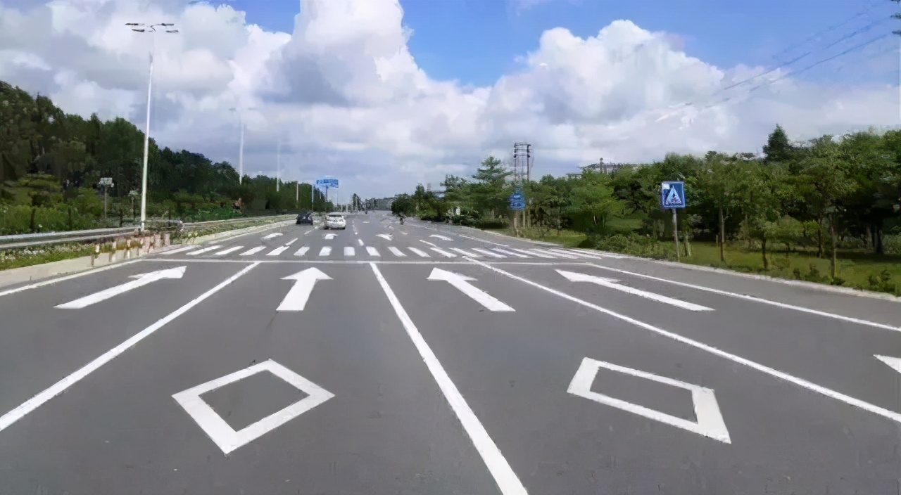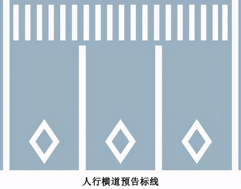 人行横道预告标线为白色菱形图案。提醒驾驶人小心前方行人,设置在到达人行横道前的道路30-50米处。