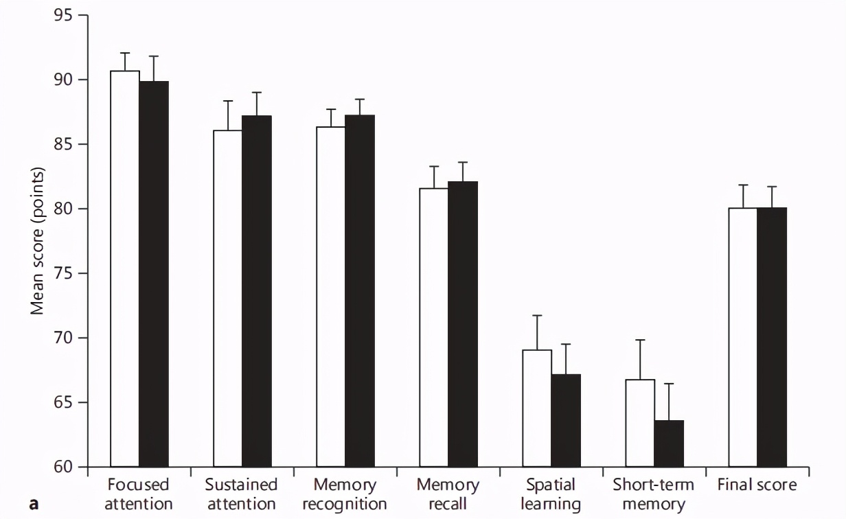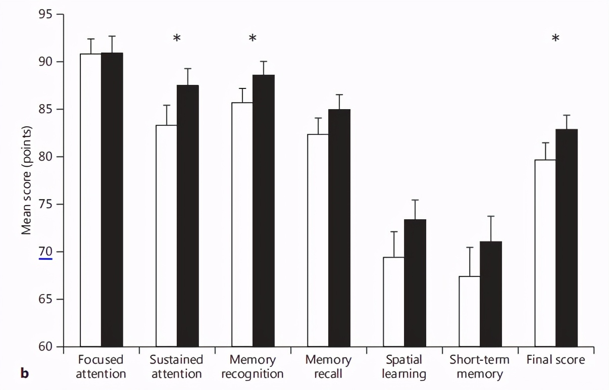 两组受试者每天服用100 mg的PS-DHA持续15周,a组维持原先的总评估水平,但在临床总体影响量表的评定中,其精神状态有明显好转;b组的7个测试参数中有6个方面得到了改善,且持续注意力,记忆识别和认知评估的最终得分达到了统计学上的显著水平。说明了PS-DHA对原先处于记忆力、注意力和认知能力低水平的患者有更明显的改善作用,且能够保持住大脑原有的能力水平(如Figure.2)。