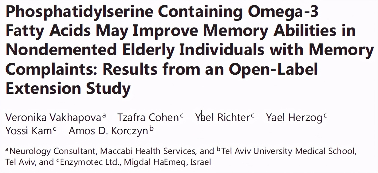 以色列特拉维夫大学神经研究团队进行开放性临床试验,发现PS-DHA(磷脂酰丝氨酸-二十二碳六烯酸)可能与改善老年人的记忆障碍有关,并将文章发表在《Dementia and geriatric cognitive disorders》上。