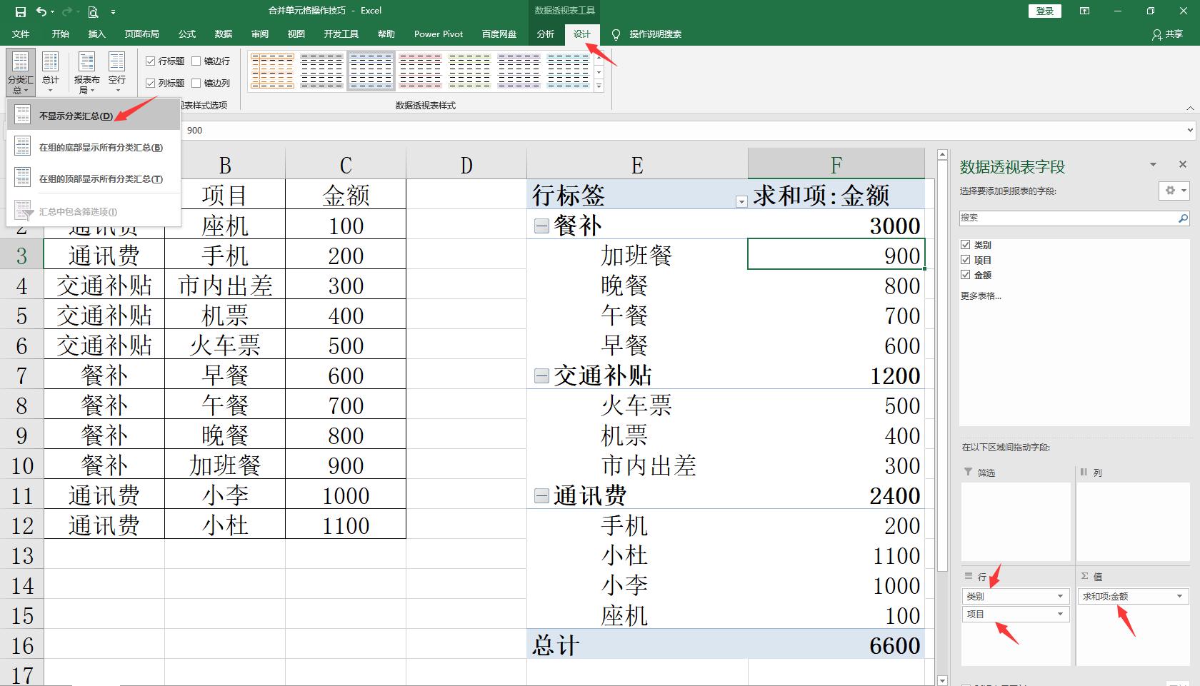 メ将类别,项目拉到行字段,金额拖动到值字段,点击透视表——设计——不显示分类汇总。メ