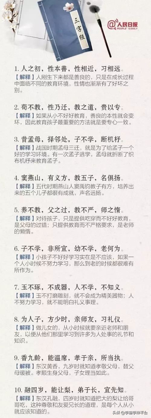 从孩子入学,就让孩子们学习诵读《三字经》。现在已经有孩子把《三字经》背得滚瓜烂熟了。但是具体的意思,未必都能解答出来。下面一起来看一下,人民日报版《三字经》全注解。在理解的基础上,记忆背诵。