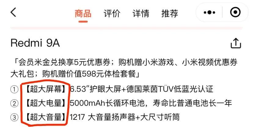 在小米官方的产品介绍中,红米 9A 主要卖点是:超大屏幕、超大电量、超大音量