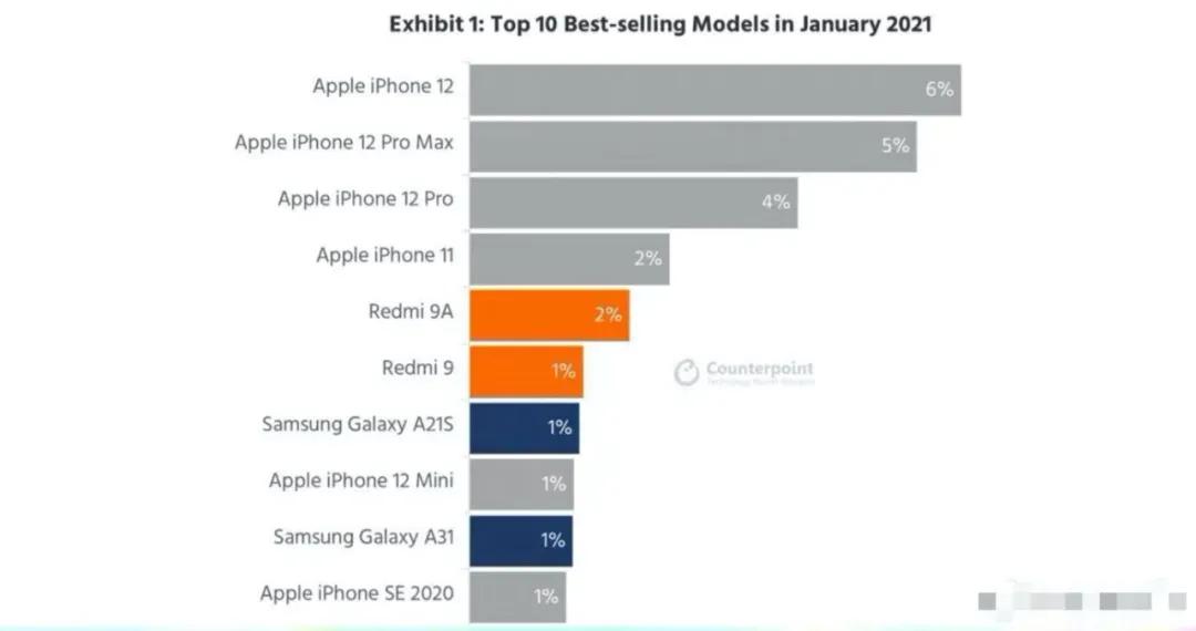 但就在今天,著名分析公司 Counterpoint Research 忽然公布了一份报告,是一月份的手机全球销量排行