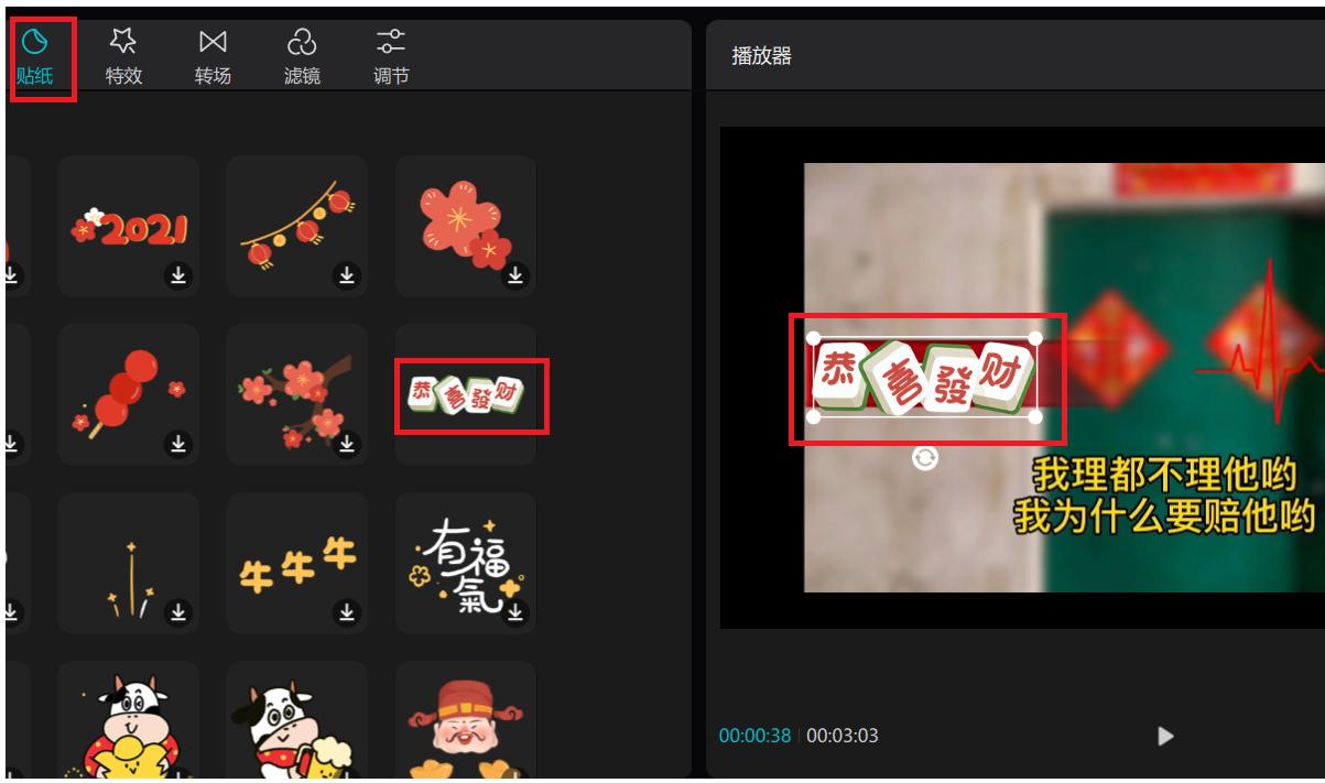 6、点击功能栏的贴纸按钮,选择与水印尺寸相应的贴纸,添加到视频中。