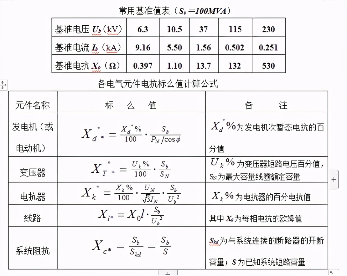 为了计算方便,通常取基准容量Sb=100MVA,基准电压Ub取各级电压的平均电压,即Ub=Up=1.05Ue,基准电流Ib=Sb/√3Ub;