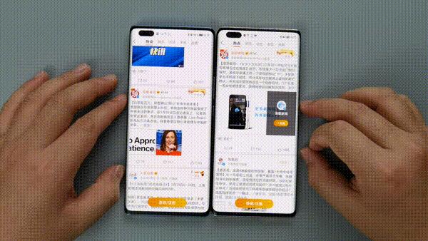 在日常生活中,我们几乎每天都要通过浏览信息来了解世界最新动态。而在浏览资讯页面或刷朋友圈时,我们总是会遇到卡顿的情况,我们下面就针对屏幕刷新率来做下对比测验。我们把荣耀V40分别设置成60Hz屏幕刷新率(左)与120Hz刷新率(右)同时进行对比。通过快速浏览微博,我们可以看出:两个屏幕在刷微博时,左侧手机出现重影、加载速度慢,而右侧120Hz的手机不但流畅,还更灵敏,可以迅速加载出内容。
