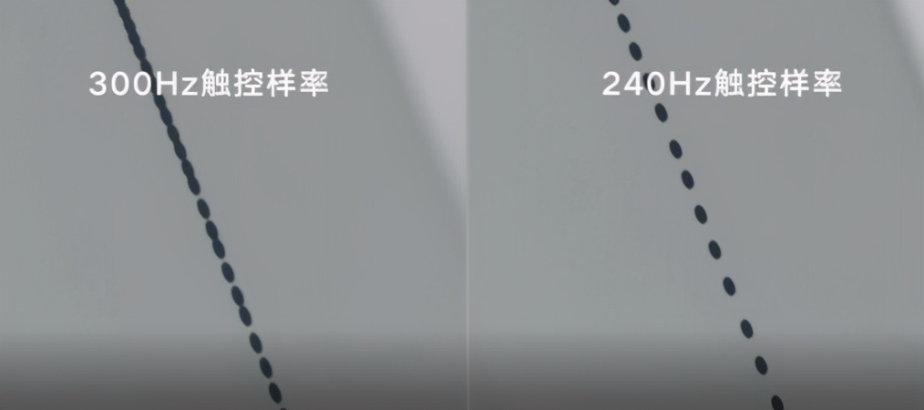 提到触控采样率,不得不解释一下它的作用。触控采样率指的是屏幕的触控灵敏度,简单说就是当你的手指触碰到屏幕时,屏幕跟随你手指动作的反应时间。触控采样率越高,屏幕的触控灵敏度也就越高。从下图我们可以直观地感受到荣耀V40手机300Hz触控采样率与240Hz手机的区别,300Hz明显比240Hz更流畅、敏度,反应速度也比240Hz快。