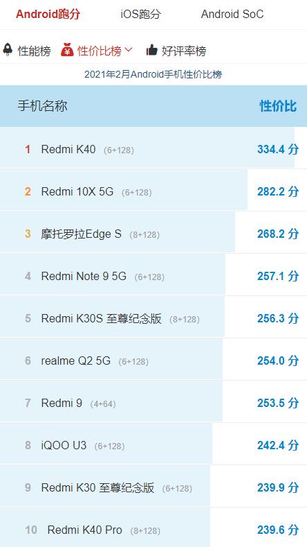 有一说一,安兔兔公布的性价比排名仅供参考,有些手机性价比确实很高,比如Redmi K30S至尊版、Redmi K40,但有些手机性价比不应该排在第六,比如realme Q2,总之仅供参考,买哪款还要看自己的喜好和需求。