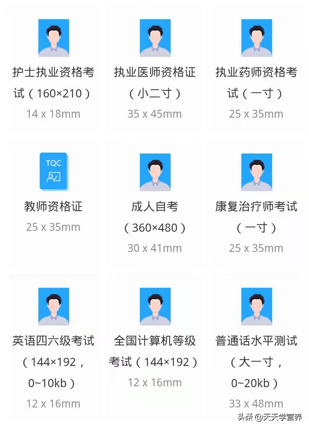 还包括了不同的职业考试所需要上传的照片规格,比如护士执业资格考试、执业医师资格证的照片、成人自考的照片规格等等。