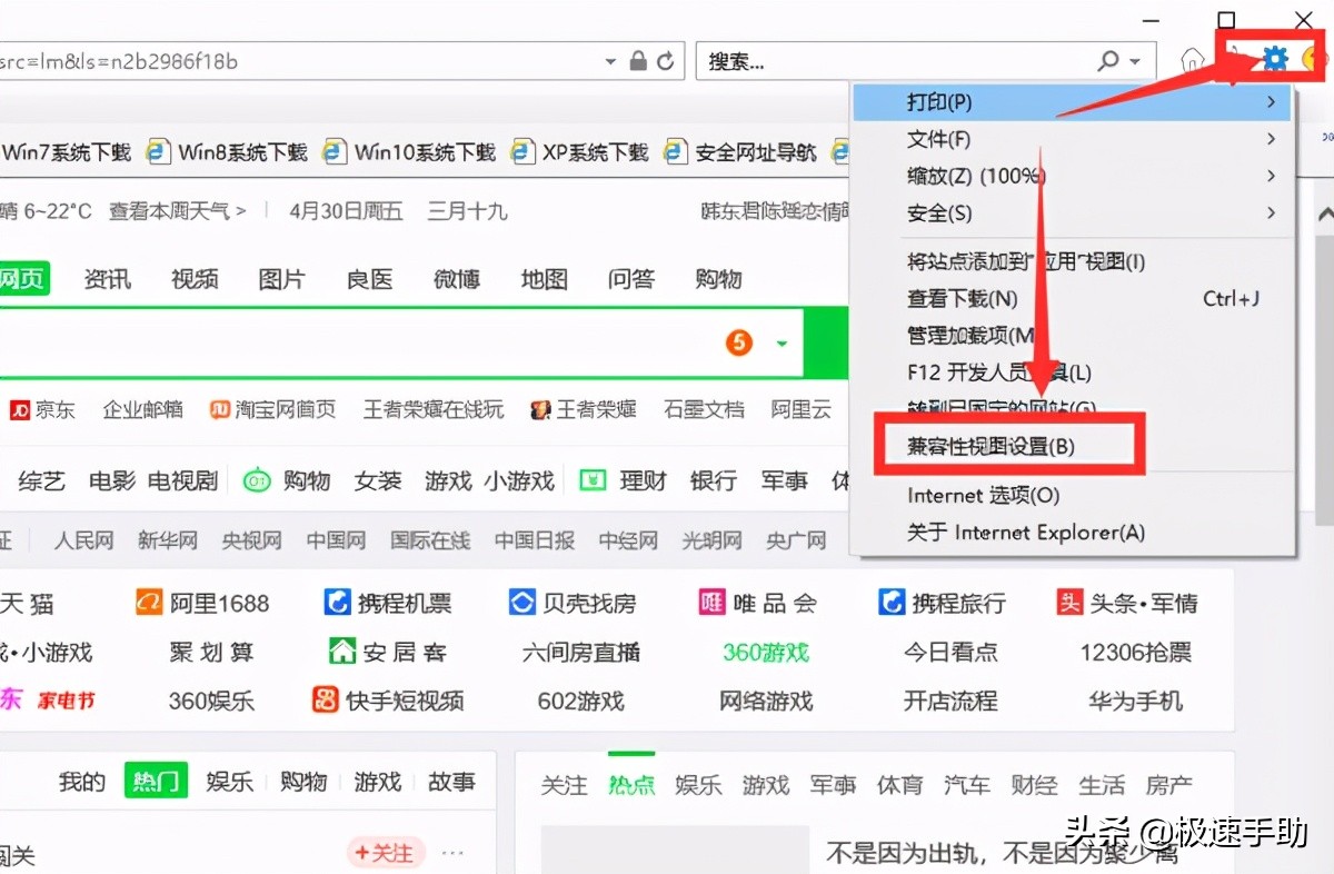 ??第二步,点击主页页面右上角的齿轮状的按钮,在展开的下拉菜单中,点击选择【兼容性视图设置】选项。?
