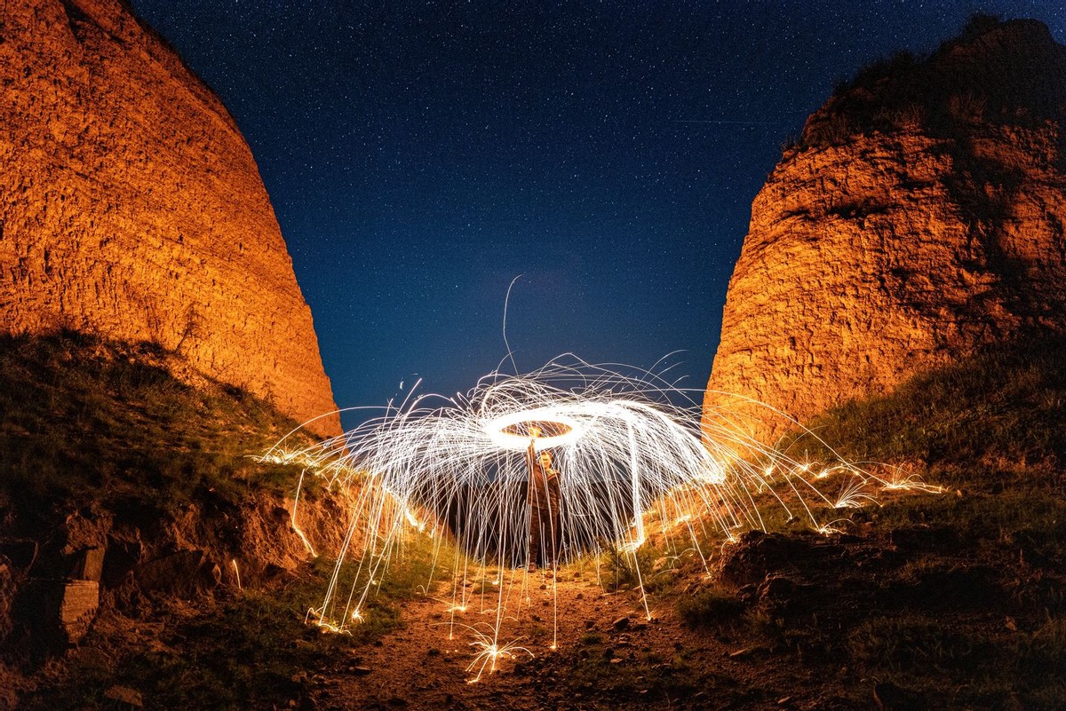 这两张照片是钢丝棉+星空,拍这种照片要注意钢丝棉不能太过曝(有一点过曝影响不大),其次还得拍到星空银河。各位应该都知道钢丝棉的亮度是很高的,而星空的亮度是很低的,如何在单张照片里保证拍到星星的同时这钢丝棉的火光还不会太亮,就得你手动设置参数。