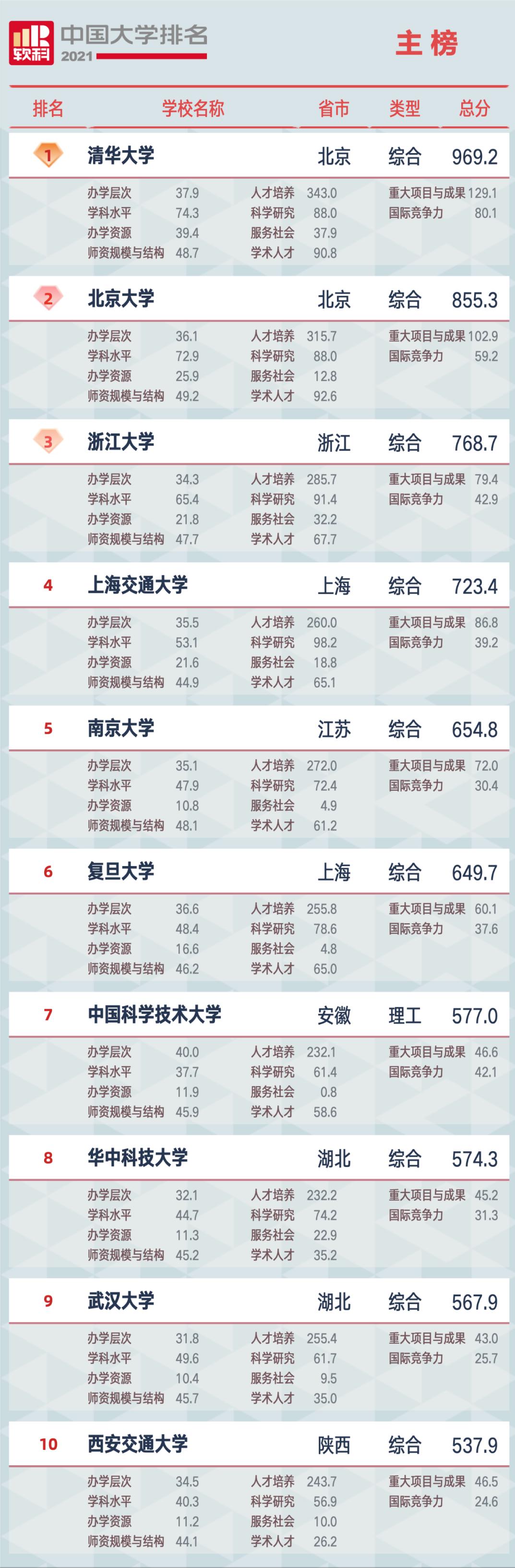 今天(20210426)软科发布中国大学排名,将1200多所高校划分为综合性大学、7类单科性大学、3类非公办大学,采用差异化的指标体系分别排名。主榜单上,清华、北大、浙大占据前三位,哈工大掉出前十,次于第十位的西安交大位列十一,山东大学被第二十名的南开大学挤出前二十,天津大学则仅次于山东大学位列二十一。值得山东人高兴的事,青岛大学位列前一百!