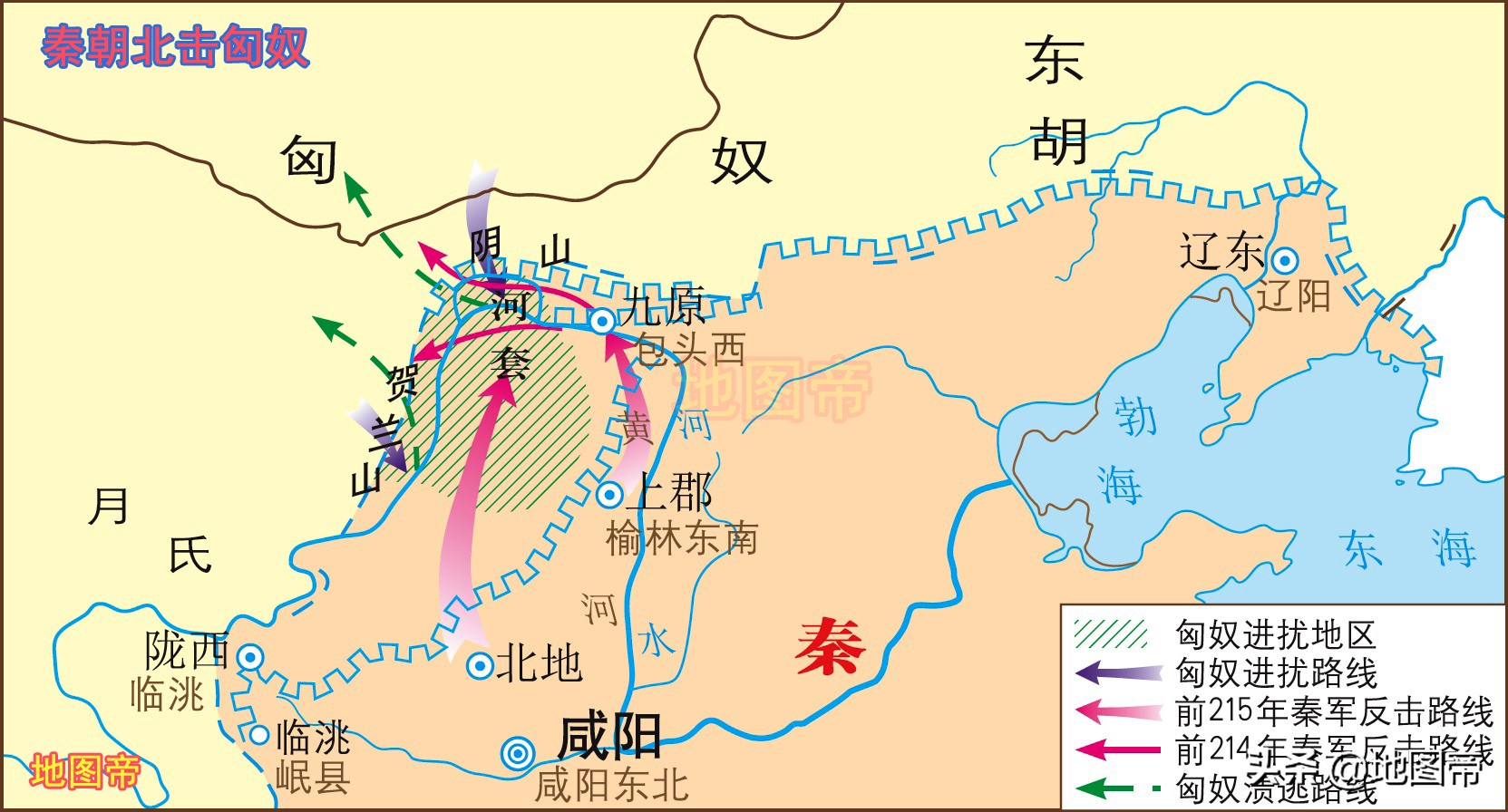 在这九条驰道中以秦直道最为特殊,它是大秦帝国心脏通往北方匈奴边境的一条“高速公路”。匈奴人举族为兵,逐水草而居,骑术精湛,彪悍灵动,经常驰入北方边境掳掠人口。面对这样的局面,公元前215年,秦始皇派蒙恬率30万大军北征,一举将匈奴势力驱逐至阴山山脉以北。随后秦军渡过黄河,控制了阴山山脉的高阙要塞,并在河套地区兴建34座城池,同时将内地人口迁徙至此,从事农业耕种。