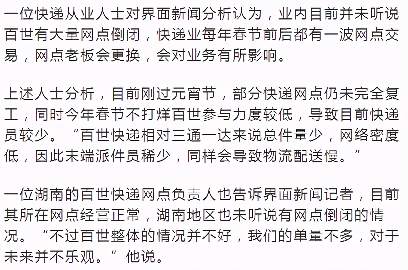 记者拨打了百世快递的客服电话,客服也随即表示,没有接到过公司任何关于网点倒闭的通知。