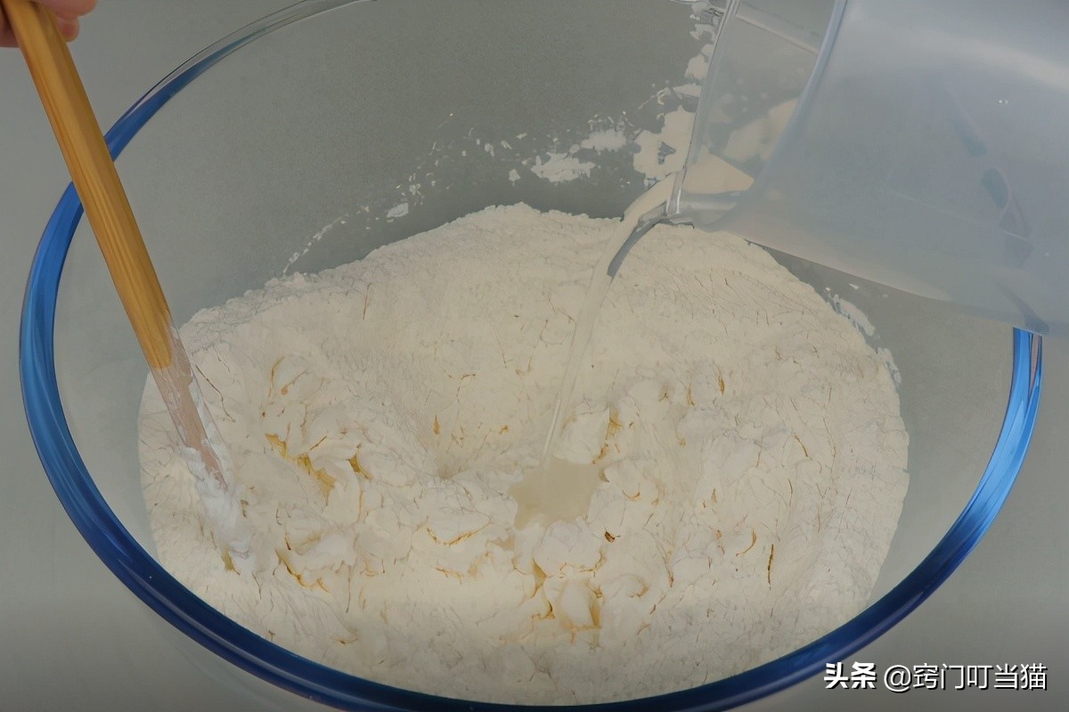 一边加水,一边用筷子快速的搅拌面粉,将面粉搅拌成面絮状就可以开始用手揉面团了
