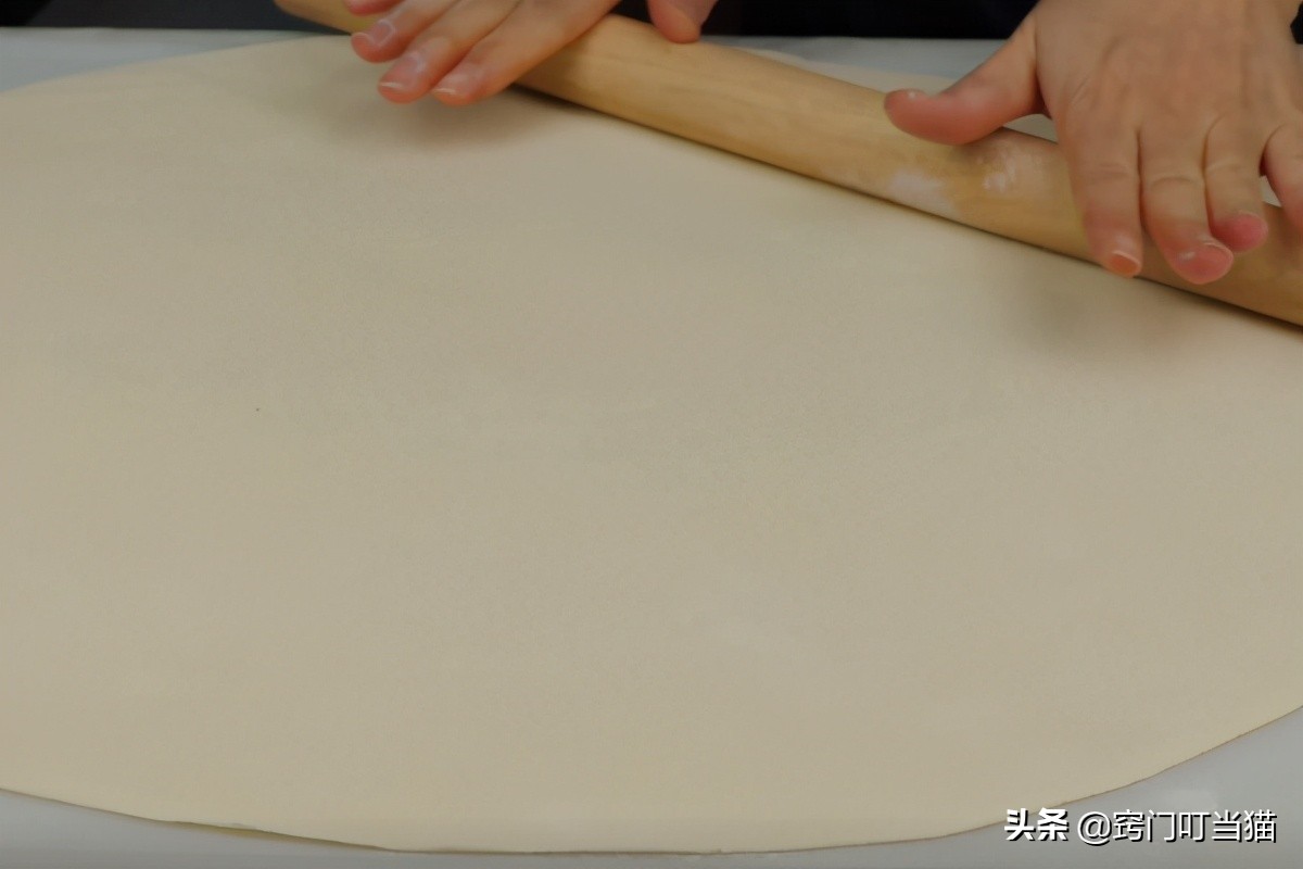 准备一个长一点的擀面杖,用擀面杖将面团均匀地擀薄擀大,可以将面皮卷在擀面杖上来回地推拉几下,面团很快速的就变成很大一个面皮了