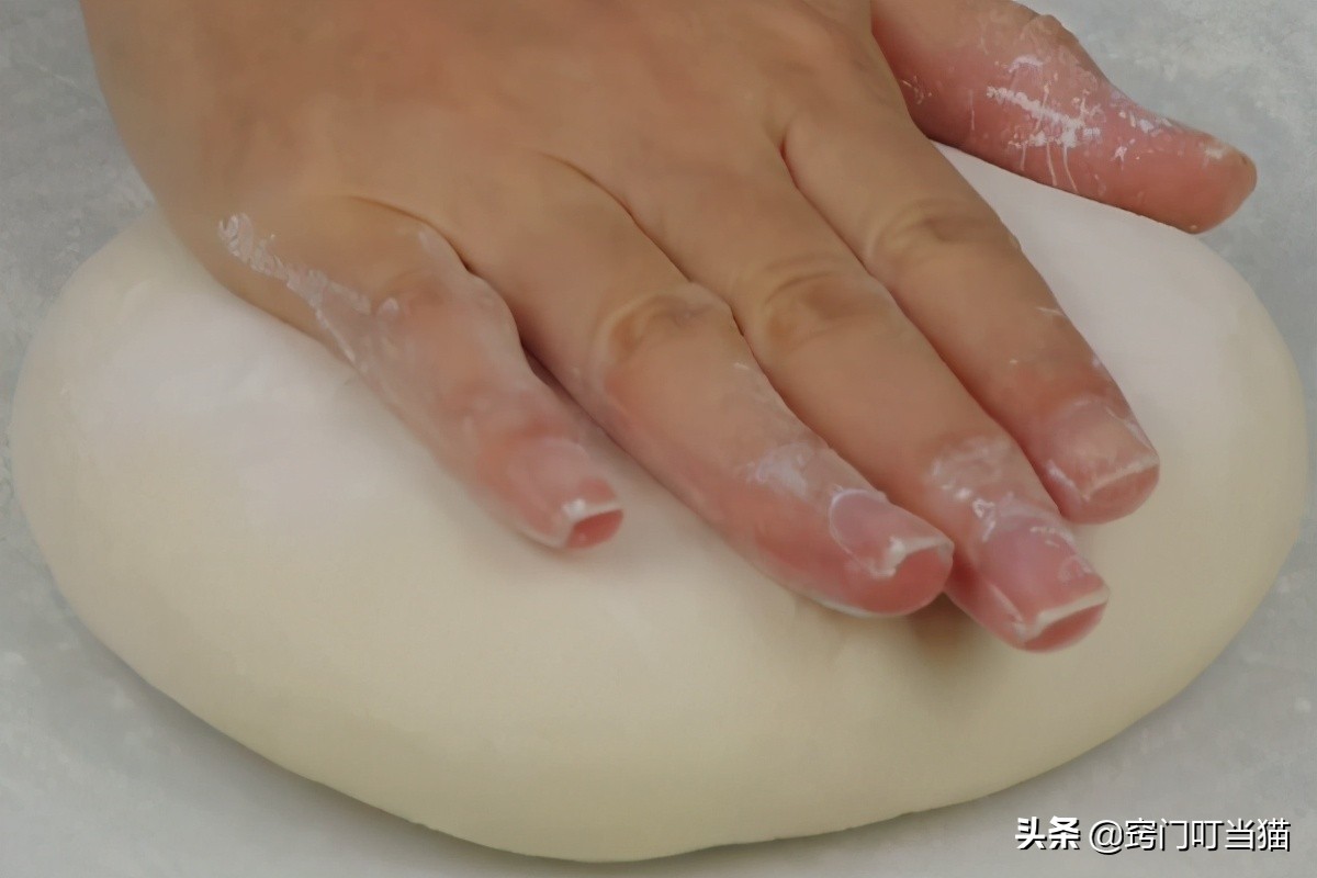 将醒好的面团放在案板上,在面团和案板上撒上一些干面粉,用手将面团压扁