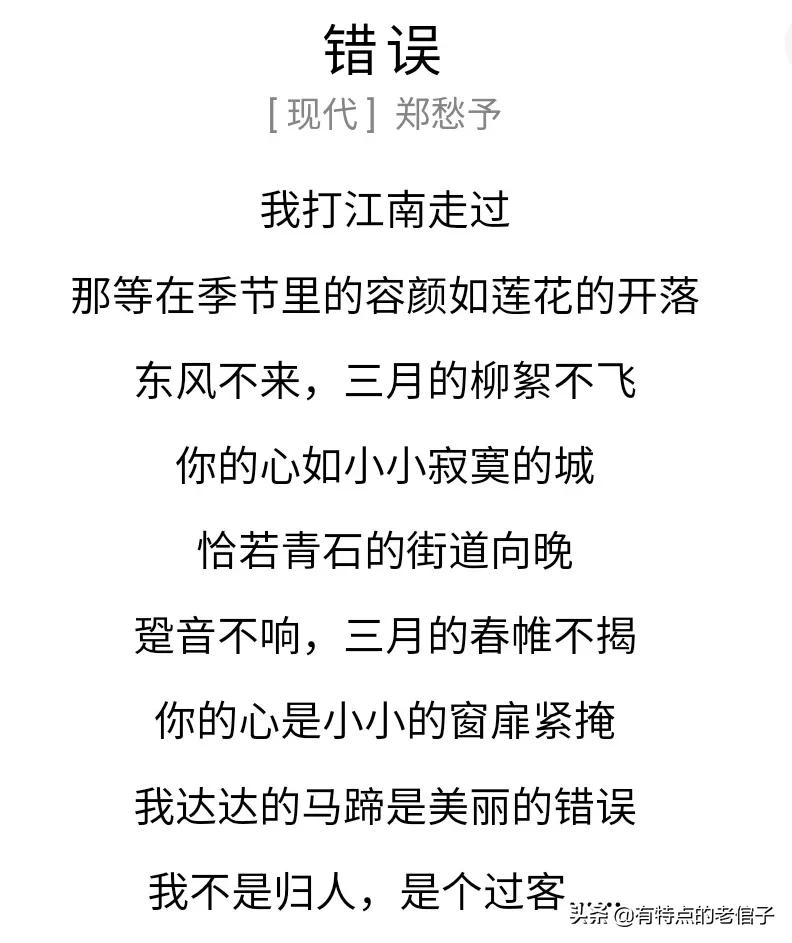 我喜欢郑愁予写的一首诗,叫《错误》。那首诗的尾句让人回味无穷:“我不是归人,是个过客”。