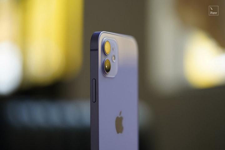 紫色 iPhone 12 的后盖依旧是亮面的玻璃材质,摄像头区域则做了 AG 磨砂处理,直角边框也是由同色系的航空级铝金属制成。