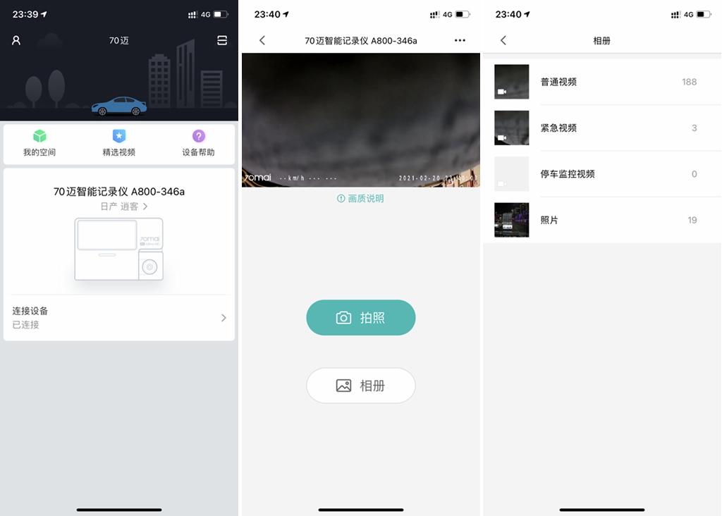 了解完两款产品的外观设计,下面来说说APP,70迈A800连接成功后,进入界面可以看到采用了简洁的布局设计,主界面除了可以实时看到当前画面,还可以进行拍照和相册的查看,在针对不同类型相片都进行了分类,方便我们后续的对应查找。