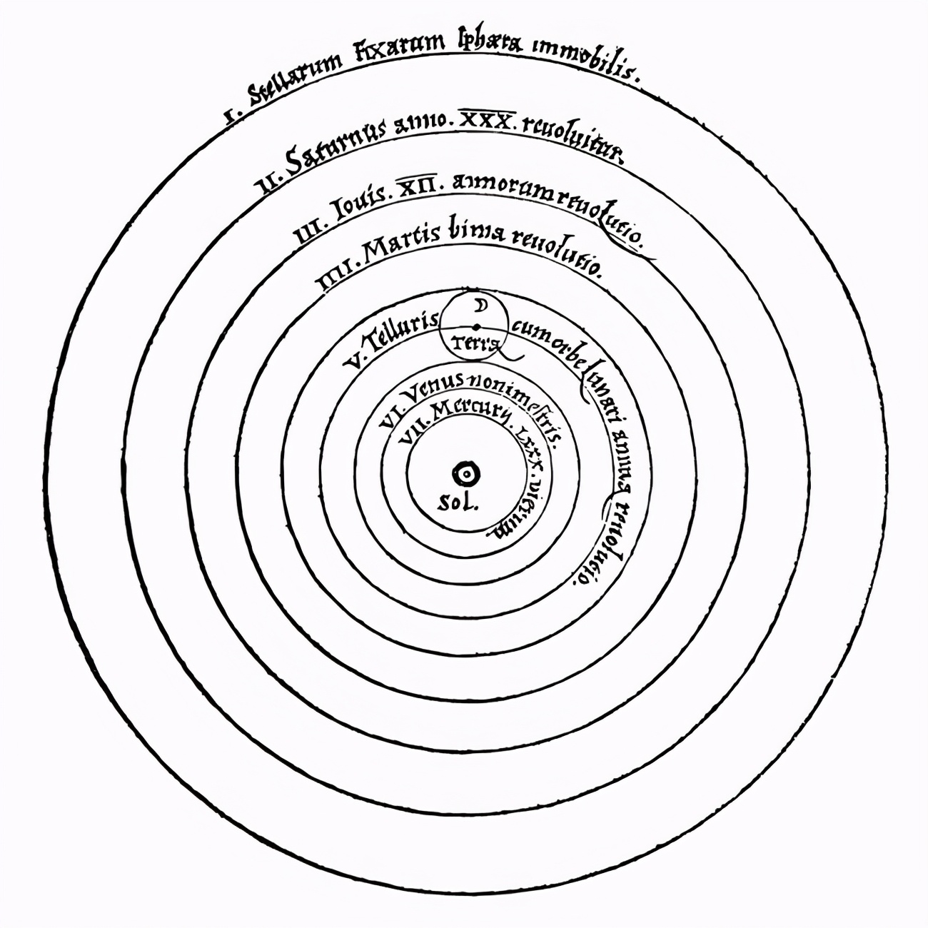 土星饶太阳一圈需要三十年时间;在土星之后是木星,饶一圈是十二年;然后是火星,转一圈要二年;地球公转一年;金星饶一圈只需要九个月;水星则仅要八十天!而太阳居于群星的中央。真的是这样——在这辉煌无比的庙堂里,这个发光体现在能够普照一切,难道谁还能把他放在另一个比这更好的位置上吗?……因此,太阳俨然系踞于王者之上,君临围绕着它的群星。——哥白尼《天体运行论》