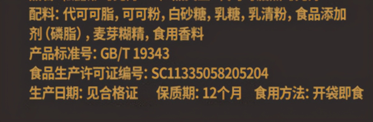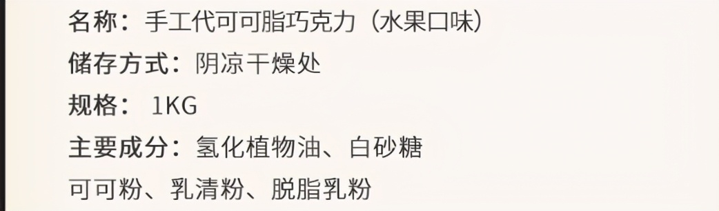 我们这里所说的产品名称并不是包装上那个大大的商标,而是产品详细信息里面的的产品名称,国标规定,代可可脂添加量超过5%的产品必须注明为代可可脂巧克力,巧克力成分含量不足25%的制品不能命名为巧克力制品,所以我们挑选巧克力第一步就要看产品名称。