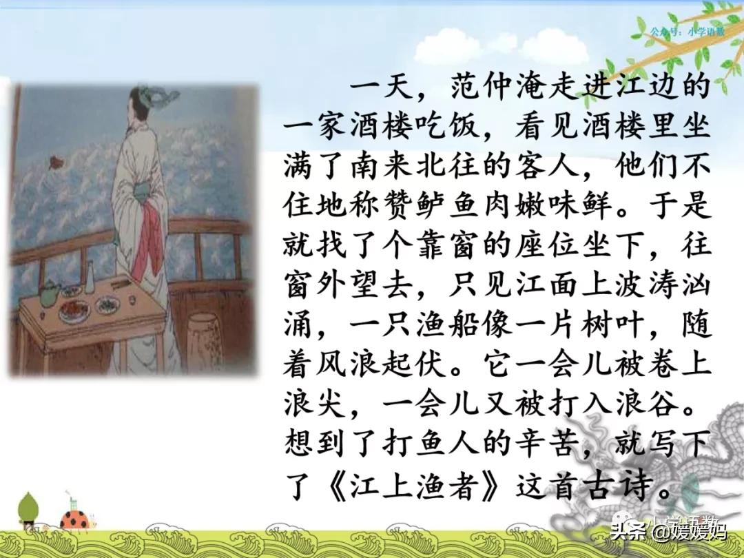 此诗具体创作时间不详。范仲淹是江苏人,生长在松江边上,他在饮酒品鱼、观赏风景的时候,看到风浪中起伏的小船,由此联想到渔民捕鱼的艰辛和危险,情动而辞发,创作出言浅意深的《江上渔者》。