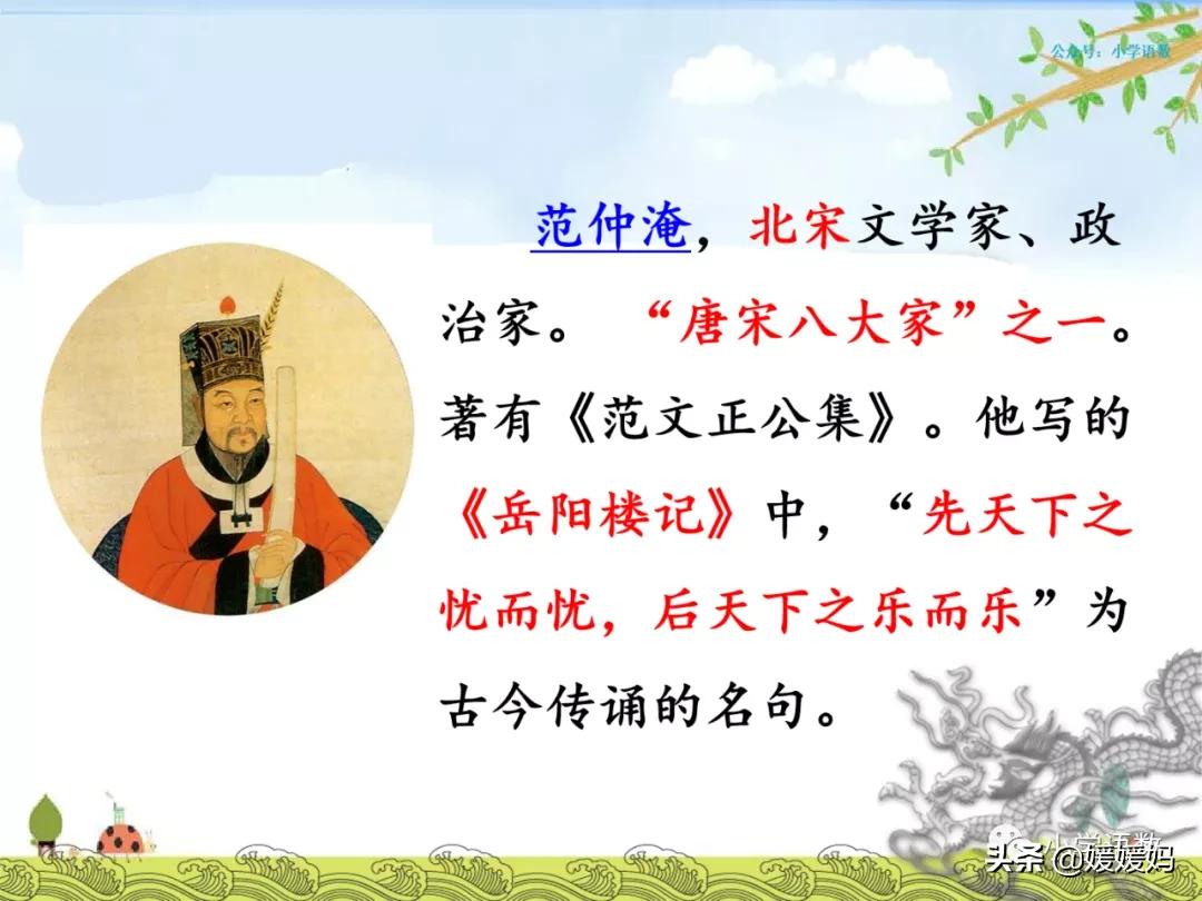 主要作品:《岳阳楼记》《渔家傲·秋思》《苏幕遮·怀旧》《御街行·秋日怀旧》《严先生祠堂记》等。