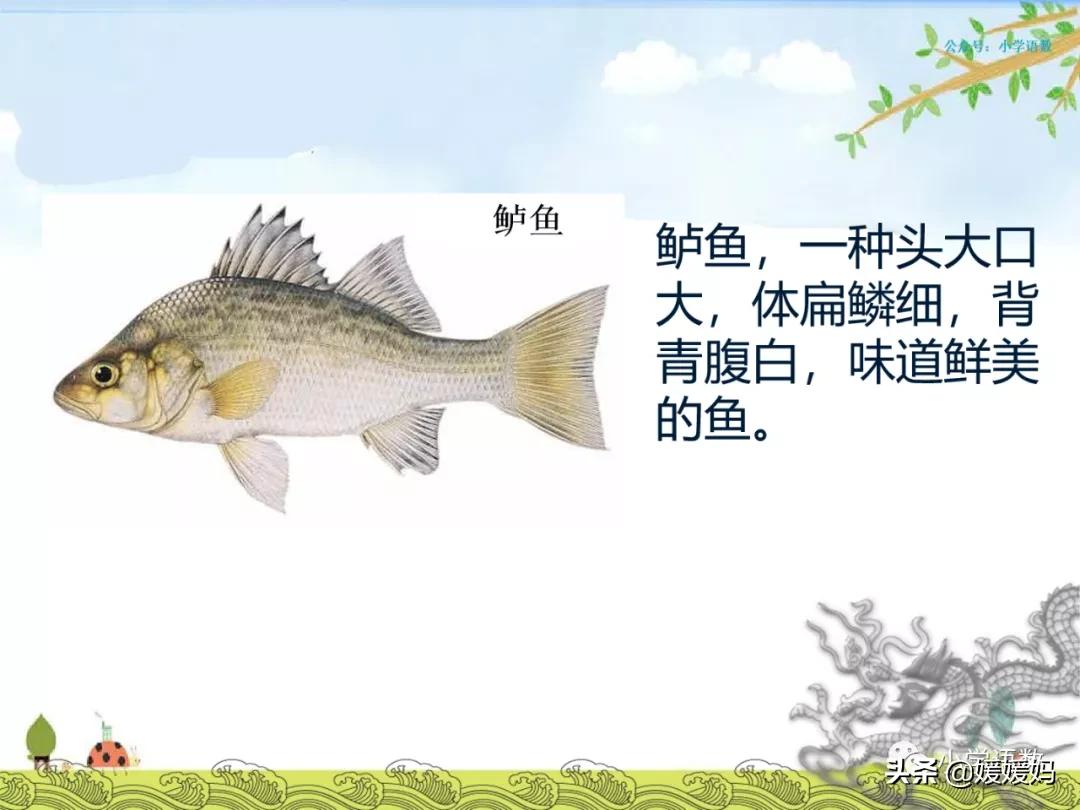(4)鲈鱼:一种头大口大、体扁鳞细、背青腹白、 味道鲜美的鱼。生长快,体大味美。