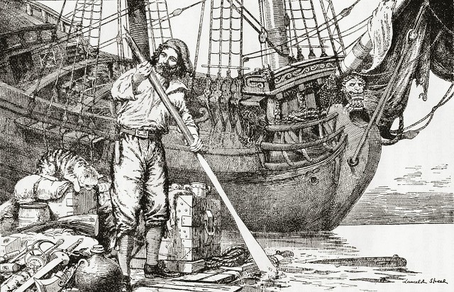 潮水退下去了,大船经还浮在海面上,离岸边并不远,他登上了大船,取回自己所需用品,也带回了一只狗陪伴她,这让他在无名的岛上能够一丝的安慰,鲁滨逊在岛上定居下来,过着孤独的生活,他每天要么拿着枪去海边打鱼,还把捕到的山羊圈养起来,后来他拥有了成群的山羊。