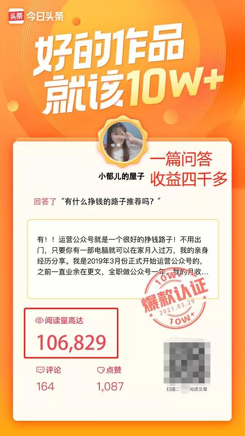我前几天回答的文章《有什么挣钱的路子推荐吗》阅读量超过了10万,单纯这一篇回答就给我带来了四百多元的收益,真香!