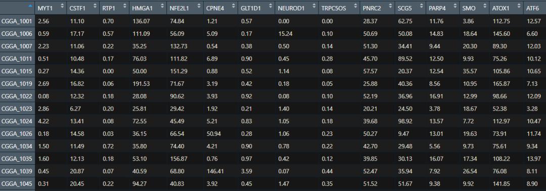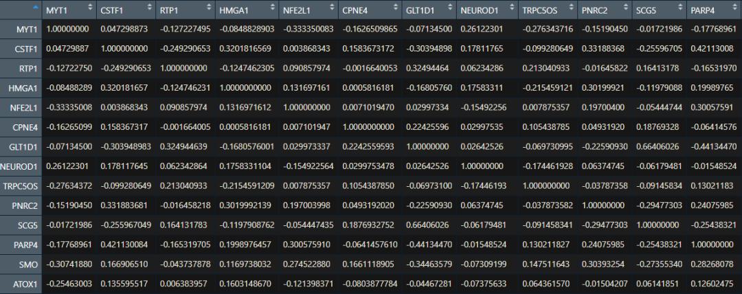 本文举例使用的数据为20个基因的表达数据,可在公众号中发送 “cor2” 获取文件(“cor2.Rdata”)。原始数据大体情况如下图所示: