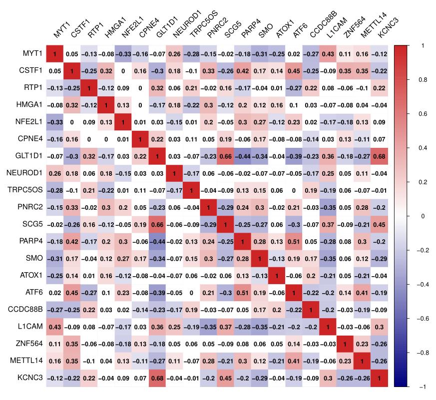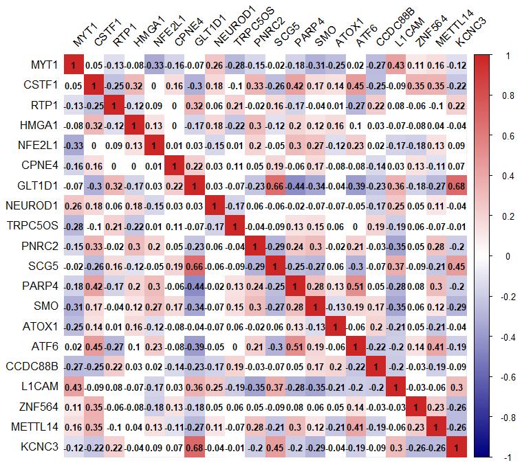 还使用cor2.Rdata数据为例:绘制相关矩阵图后发现,GLT1D1与SCG5呈显著正相关,KCNC3、L1CAM与GLT1D1和SCG5都呈显著正相关。