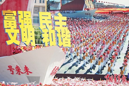 2009年10月1日,在首都各界庆祝中华人民共和国成立60周年大会上,红色玫瑰和蓝色花球簇拥着“贯彻落实科学发展观”标语,当3200人组成的“科学发展”标语方阵行进到天安门城楼前时,图案变换为“社会和谐”。
