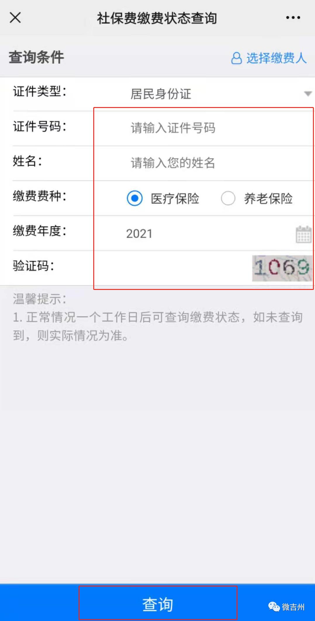 选择【我要查询】→【社保费缴费状态查询(城乡居民)】,输入身份证号和姓名,输入验证码。